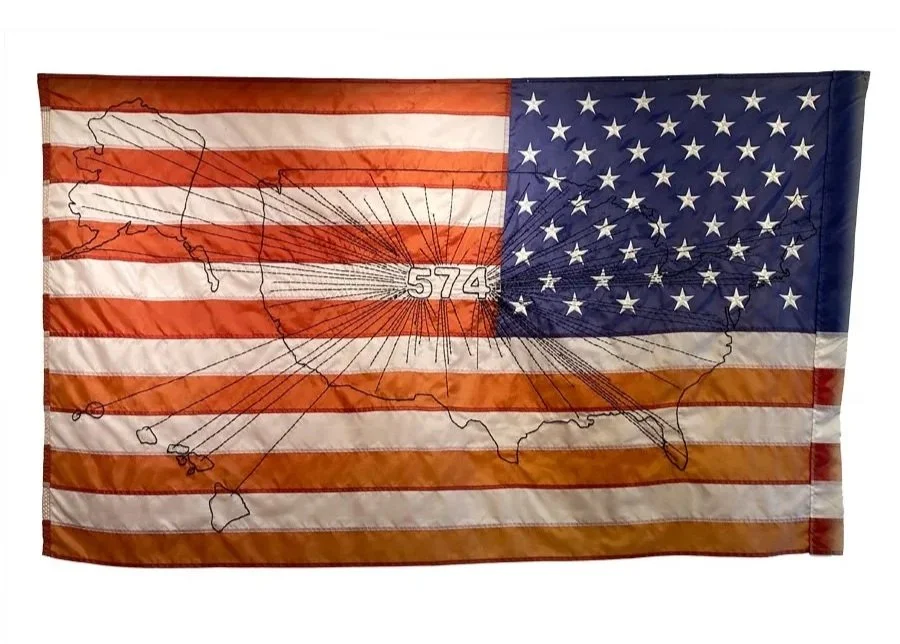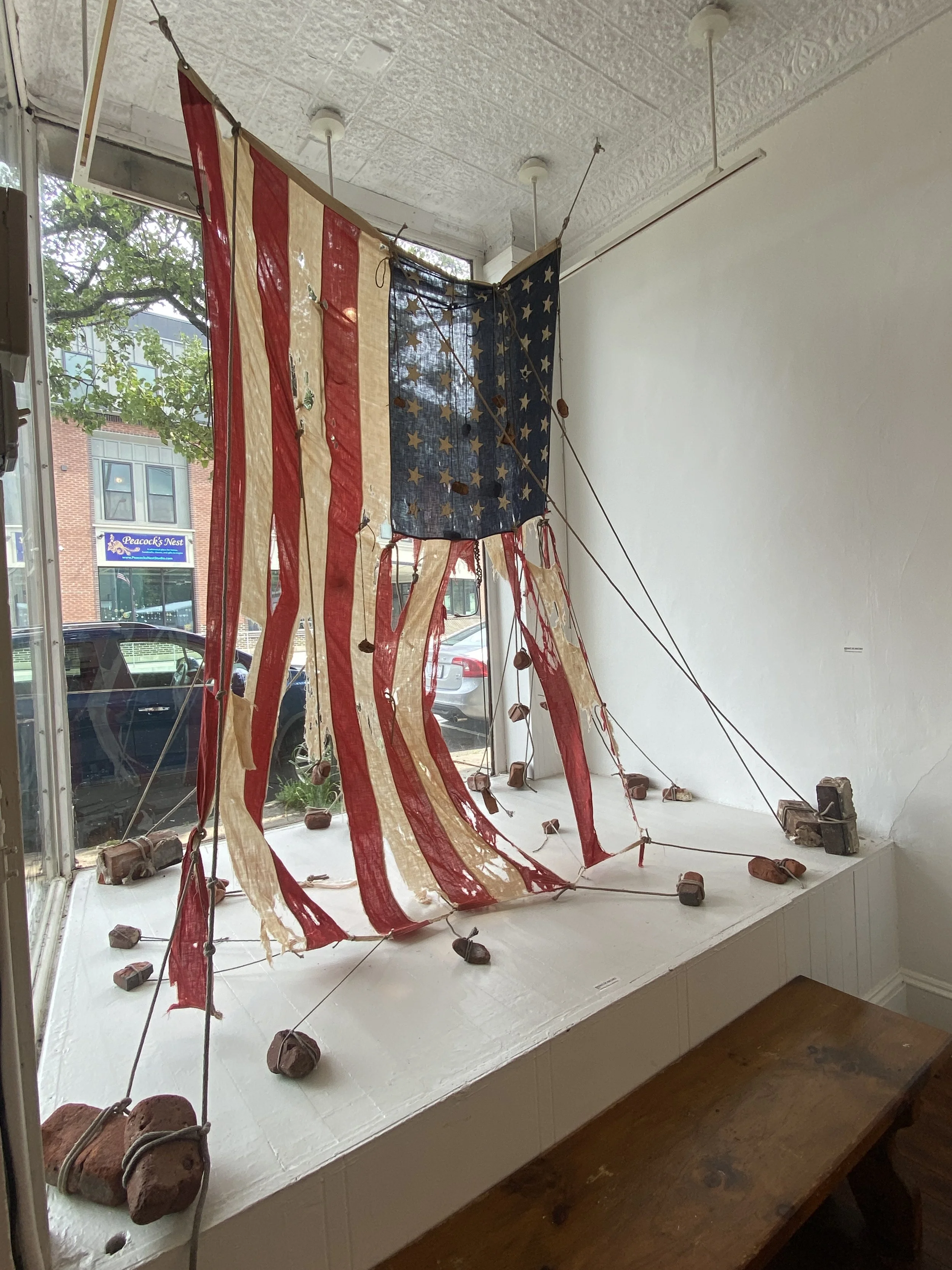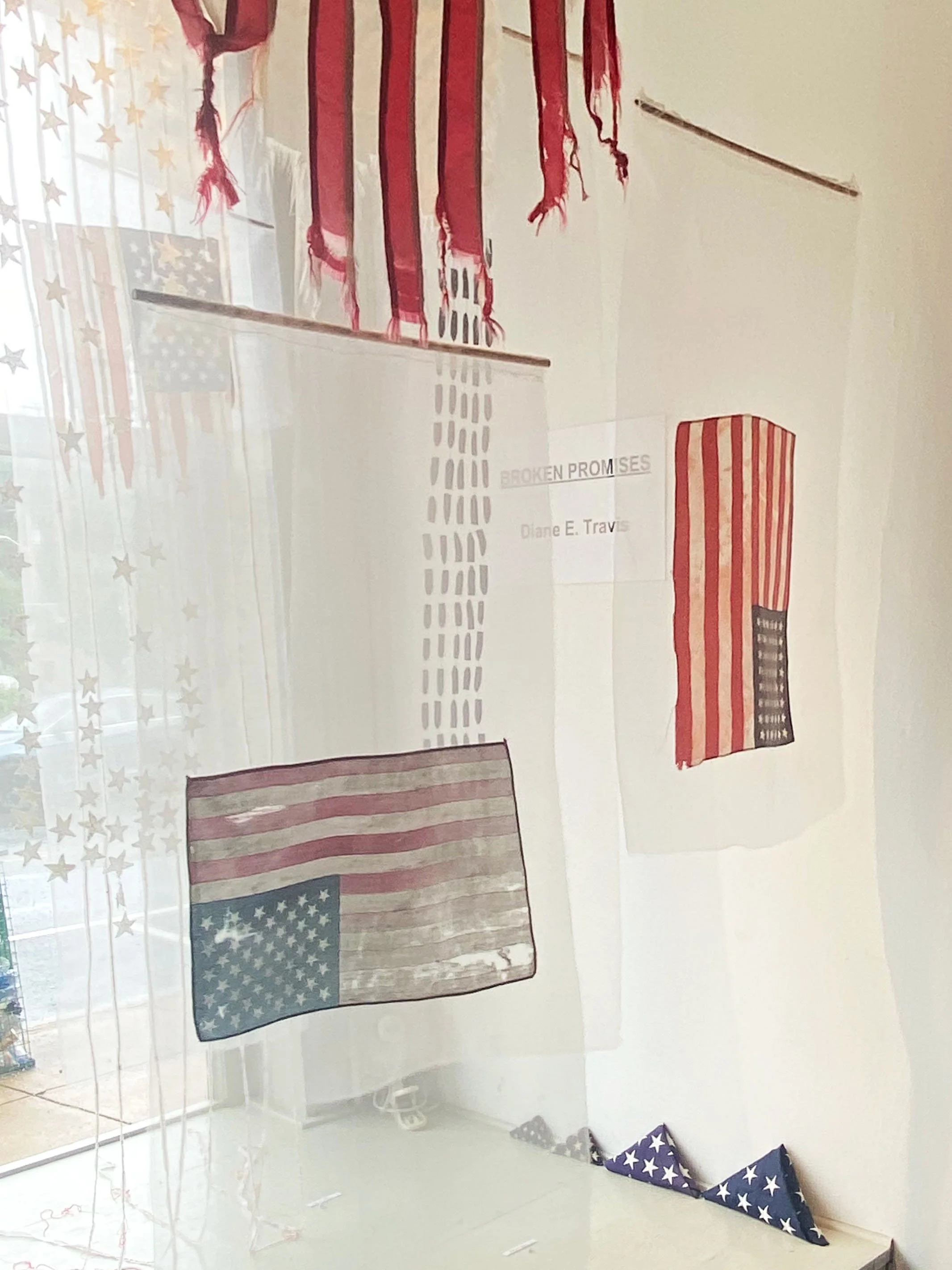 I continue to find flags and fragments of flags wherever I walk or drive. I feel compelled to pick them up. I wash, iron, and handle them with care, tenderness, and reverence. All the flags in this exhibit are presented in their original found condition. They have been hand-stitched onto backgrounds, embellished with embroidery, appliqué, and sculptural elements.