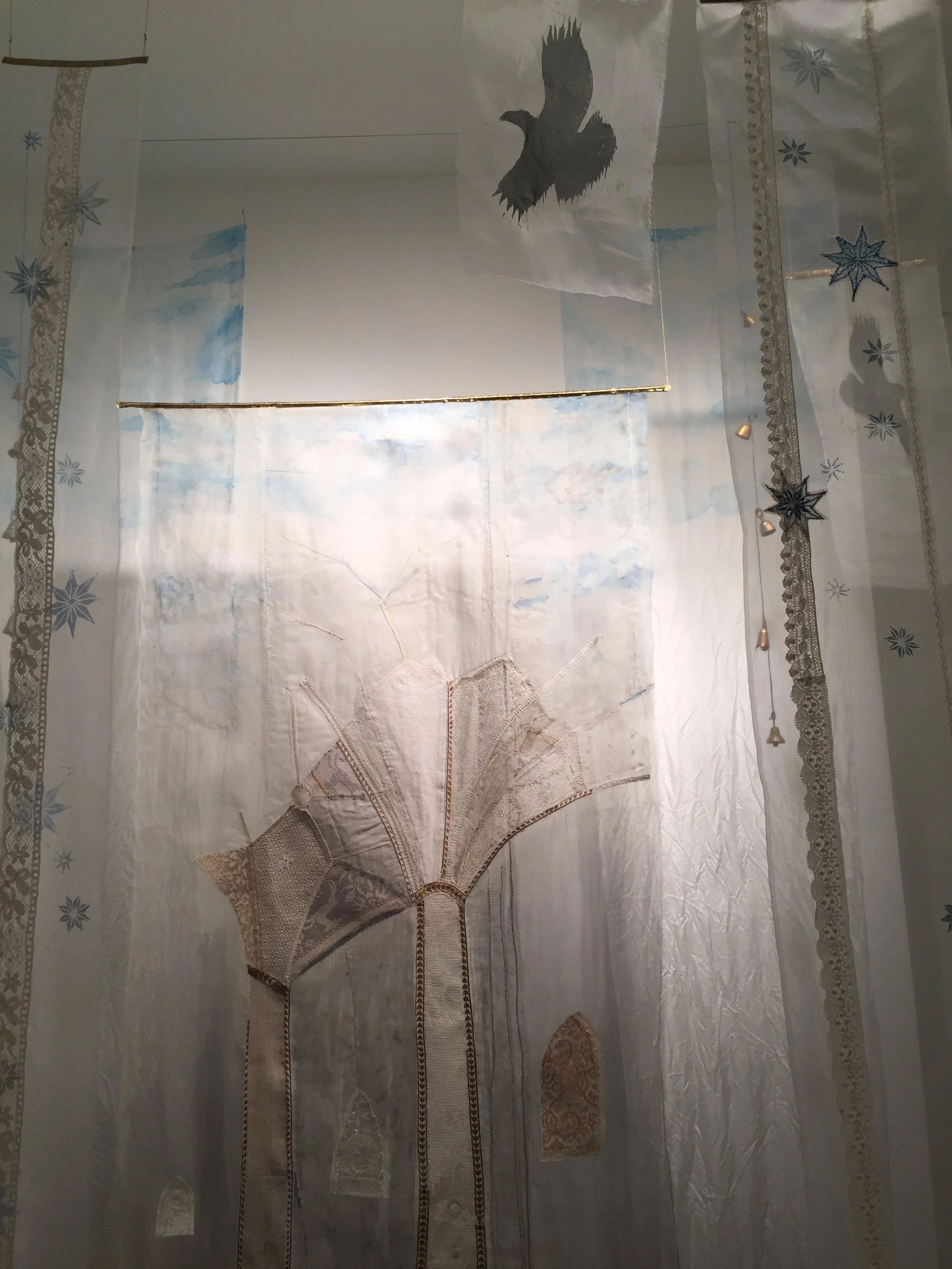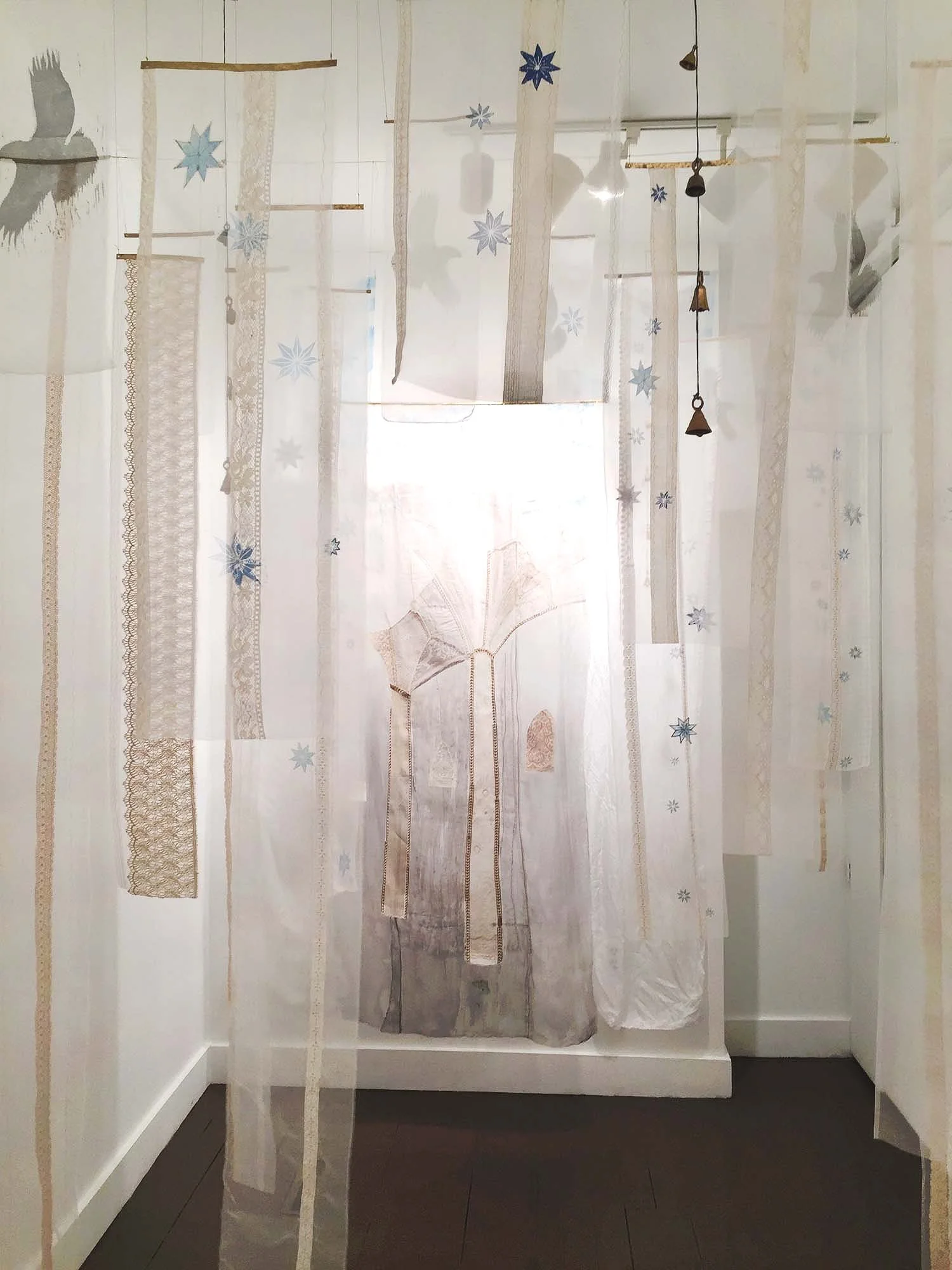 Through the installation of sewn silk organza panels collaged with hand-painted and collected fabrics, lace and woodcut images of stars and crows, I have tried to create the feeling of the Franzis Kanner church that lives on in my memory.